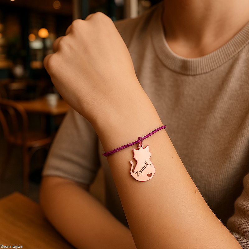 Pozłacana srebrna bransoletka na sznurku kotek z grawerem rose gold