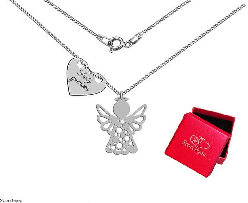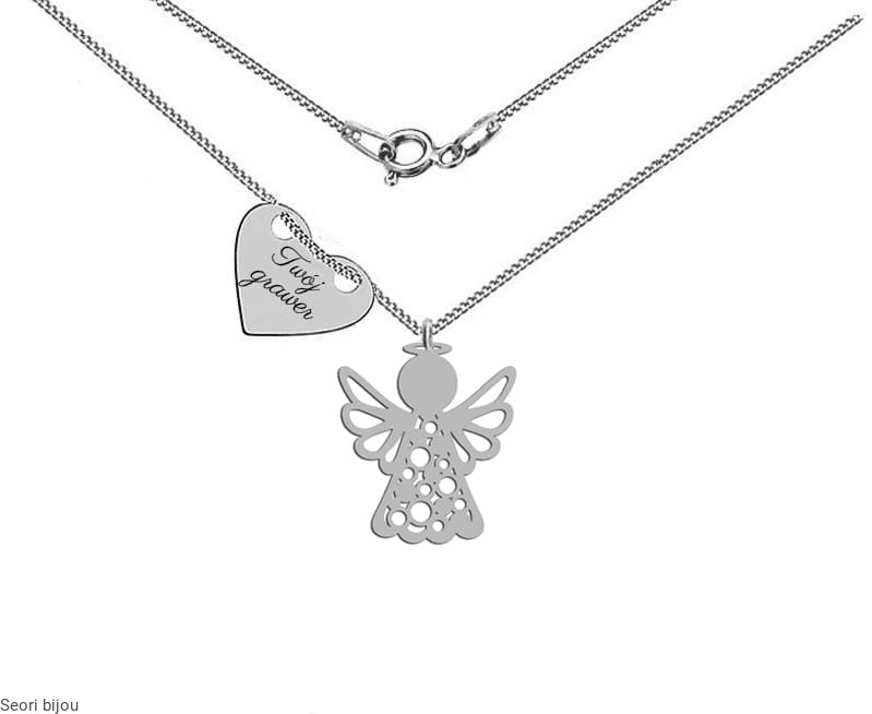 Rodowany srebrny naszyjnik Aniołek ażurowy i serce z grawerem